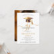Celebrate your achievement in style with this modern graduation party invitation, featuring a sleek design with a gold graduation cap and topper, and elegant gold script calligraphy initials. The clean design adds a touch of sophistication. Gold and black type. Available in print, as a digital download, or both.