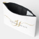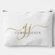 An elegant modern minimalist style monogrammed accessory bag, with a sans serif name and elegant gold swash script initials on white.