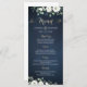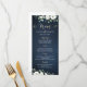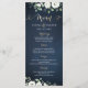 Modern faux gold menu calligraphy and watercolor white floral eucalyptus greenery on dark navy blue background, elegant and stylish, great for greenery rustic wedding, botanical garden wedding, boho floral wedding in summer and winter.