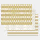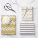 Here's a pretty gold and white Holiday series of wrapping paper. One paper has a fashionable bold chevron stripe pattern. One has a gold snowflakes design in a stripe pattern on a white background.The third paper has a modern gold and white stripe pattern. All the colours coordinate beautifully together.