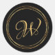 Sticker label with modern golden circular entwined pattern on black background surrounding your monogram initials. You can change the background colour