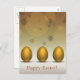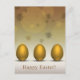 An abstract and modern Easter illustration featuring 3 golden Easter eggs on a bokeh background with abstract flowers.