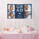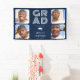 Simple GRAD photo collage graduation banner. Design features 4 square pictures of the grad, decorative lettering, a mortarboard, name, place of study and class year. The navy blue background can be changed to any colour of your choice.