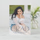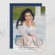 Announce your high school or college graduate's graduation with this modern graduation announcement. The graduation announcement displays "Grad" in trendy navy lettering with the graduation year displayed inside of the letter 'd'. Personalise the front of the announcement with the graduate's vertical senior photo, name, and school. The announcement reverses to feature an additional photo displayed inside of a white square frame with your message shown below.