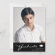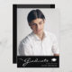 Amazing graduation announcement card, featuring design elements of modern text fused with elegant calligraphy script. The graduates photo highlights the front of the card while the back of the card offers personalised text spaces for information about the graduation and future journey. Backgrounds are black with a thin gradient on the front and regal shades of grey and black on the back. To see more items like this, visit my store here at "www.Zazzle.com/LakeViewCardCo". Thanks
