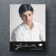 Amazing graduation announcement postcard, featuring design elements of modern text fused with elegant calligraphy script. The graduates photo highlights the front of the card while the back of the card offers personalised text spaces for information about the graduation and future journey. Backgrounds are black and a thin gradient on the front while the back of the card has black and white text on a silver grey background. To see more items like this, visit my store here at "www.Zazzle.com/LakeViewCardCo". Thanks