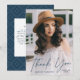 Modern photo graduation thank you card featuring the graduate's vertical photo with "thank you" in a handwritten navy calligraphy script overlay and optional white gradient. Personalize the front of the graduation thank you card by adding the graduate's name and graduation year. The photo thank you card reverses to feature your custom message with a trendy navy and white dotted geometric pattern. Remove the custom message to handwrite your own.