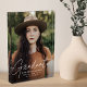 Celebrate your graduate's achievement with a custom graduation photo keepsake. The photo block features the graduate's vertical photo with "graduate" displayed in a trendy white script. Personalise the modern graduation photo block by adding the graduate's name, school, and graduation year.
