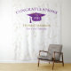 Modern graduation celebration backdrop for photo opportunities! Glitter at top and bottom, gold streamers from top edge, graduation cap and lettering in purple, name template in gold. Class of in gold glitter script lettering with template of year in white. Add year, name and school name.