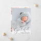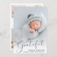 A modern card to announce your baby's birth, featuring their photo overlayed with "Grateful" written in an elegant script with a heart swash. Underneath add their name, birth date and birth stats. On the back, add three additional pictures and a personalised message.