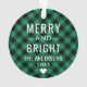 Photo ornament design for the holidays features your favourite image with year text in white (can be customised) with emerald green and black buffalo plaid pattern on the back. Personalise the custom "Merry and Bright" monogram name & year text on the back or remove. Photo tip: crop photo to square format before uploading it to the design template.