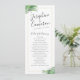 Realistic looking green palm tree leaves surround a gold-coloured geometric border on a simply modern and elegant tropical beach destination wedding program with minimalist flair.