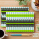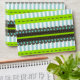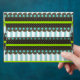 Very stylish pattern of stripes, polka dots, dashed and scalloped lines. This unique pattern consists of colours like lime green, dark brown, mint blue and white.