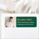 Modern custom address label design features a graduation photo of the graduate with gold and white return address text and green background. Customise the text and background to coordinate with photo or school colours!