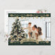 Elegant green and gold botanical photo Christmas postcard featuring a photo adorned with holly and falling snow on the front and a watercolor painting of poinsettia, holly and red berries.