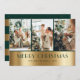 Modern custom green and gold Merry Christmas photo cards featuring green and gold stripes with gold confetti at the back and photo collage on the front. Easily personalise these photo collage Christmas cards with your images and text.