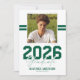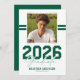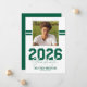 Announce a major milestone with this modern masculine graduation announcement card. Featuring a sleek white background, the front showcases a square photo of the graduate accented by two sporty green stripes running through the background for a bold, athletic feel. A strong “2026 Graduate” title is paired with the graduate’s name and the school, college, or university they attended.