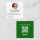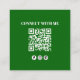 This design features a social media style business green-themed card with a QR code on the back, with your logo here, or photo template, a modern minimal style with a website, email mobile phone, and contact information, with connect with us, and Instagram follow us, perfect for a freelance influencer or any professional.