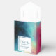 Wedding favour box with a cool and stylish abstract design. Watercolors mix and mingle to create the illusion of a space image. Green with swirls of purple, yellow and light red blend together with a smattering of white dots and stars. A cool trippy creation.  A white square layered over top with your text inside.