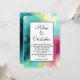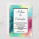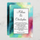 Wedding invitation with a cool and stylish abstract design. Watercolors mix and mingle to create the illusion of a space image. Green with hints of purple, yellow and light red blend together with a smattering of white dots and stars. An elegant artistic creation.