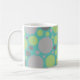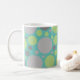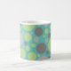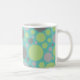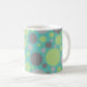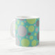 Modern pattern features large and small bubbles of kiwi green and shades of grey on aqua / turquoise background
