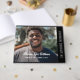 Memorial service guest book printed with a large photo of your loved one, with their name and years living in white and, on the side, in loving memory in grey against a black background. Photo guestbook for a funeral service where your friends and relatives can write down a memory or a quote to honour your loved one who has passed. Add your loved one's name in a retro script across a photo of them. Honour your loved one who has passed at their memorial service with this in loving memory guest book in black and grey, personalised with their photo, name, and years living.