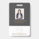 Modern real estate employee name badge with photo and logo. Designed with dark grey and gold tone colours with a place for your photo, logo, name, title and company name. Perfect for a Realtor, Agent, Broker or any professional in the housing market. Use during open houses, client appreciation events and home tours.