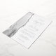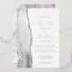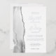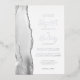 The left-hand edge of this elegant modern wedding invitation features a grey and white watercolor agate border trimmed with faux silver glitter. The customisable text combines handwriting, copperplate and italic fonts in real silver foil on a white background. The reverse side features a matching grey, white and silver agate design.