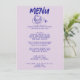 A colourful retro funky modern blue and purple wedding dinner menu. Which features chic template design of lavender background and black blue grunge written typography. With Hand drawn cake and knife . A Perfect and matching with the whole suite.
