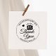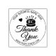 This "Thank You" stamp features a sewing utensil, business name with monogram and thank you message.
