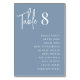 Simple and chic table number cards in Dusty Blue and white make an elegant statement at your wedding or event. Design features "table [number]" in handwritten script lettering, with individual guest names below in timeless serif typography. Design repeats on both sides.