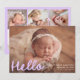 Welcome your little one in sweet style with this whimsical photo birth announcement featuring your baby’s horizontal photo with “Hello” displayed in a playful lavender script overlay. Add your baby’s name, birth date, and stats on the front to create a truly personal keepsake. The back showcases a collage of six square photos with space below to include family names or a heartfelt message. A lovely choice for baby girls or dreamy, pastel-inspired themes.
