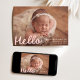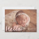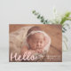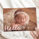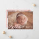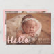 Welcome your little one with this sweet and simple birth announcement design featuring your baby’s horizontal photo with “Hello” displayed in a soft blush-pink handwritten script. Customise with your baby's name, birth date, and stats on the front, while the back showcases a collage of six square photos with room below for your family’s names or a short message. This charming design is perfect for baby girls and adds a warm, tender touch to your big announcement.