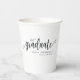 A modern handwritten script graduation party paper cup. This paper cup features a simple black and white theme with an elegant font. Add the graduates name and high school or college for the perfect personalised graduation party cup.