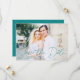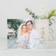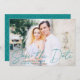 Announce your wedding date in style with our trendy modern photo save the date cards. The design displays your full-bleed horizontal engagement photo with "Save the Date" in a teal handwritten script overlay with an optional white gradient. Personalise the front of the save the date photo card by adding your names, wedding date, and wedding location. The simple save the date photo card reverses to a teal and white dotted geometric pattern.
