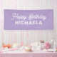 Custom purple birthday party banners with white text bring a fun and stylish touch to any celebration, featuring a soft lavender background paired with elegant script and bold retro lettering for the personalised name. This eye-catching birthday banner is perfect for girls' parties, teen celebrations, or whimsical adult gatherings, adding a playful yet polished look to party decor. The combination of a modern pastel colour palette and vintage-inspired typography makes this design ideal for decorating dessert tables, photo booth backdrops, or entrance walls. A beautiful choice for anyone looking for a personalised lavender birthday banner with a fresh and charming aesthetic.