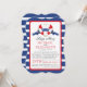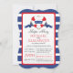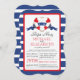 Modern Heart Buoy Engagement Party Invitation featuring a red and blue heart buoy with a fun bold wide blue and white stripe background. Flip the invite over to find a matching stripe back. Perfect unique nautical invitation to announce your engagement to your friends and family.