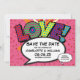 Featuring love hearts confetti, a fun, cool and trendy comic book inspired save the date card that puts the wham, zap, pow into your wedding date announcement. The reverse features a matching love hearts confetti on a pink comic book polka dot pattern which you can replace with your own image or photo. Designed by Thisisnotme©