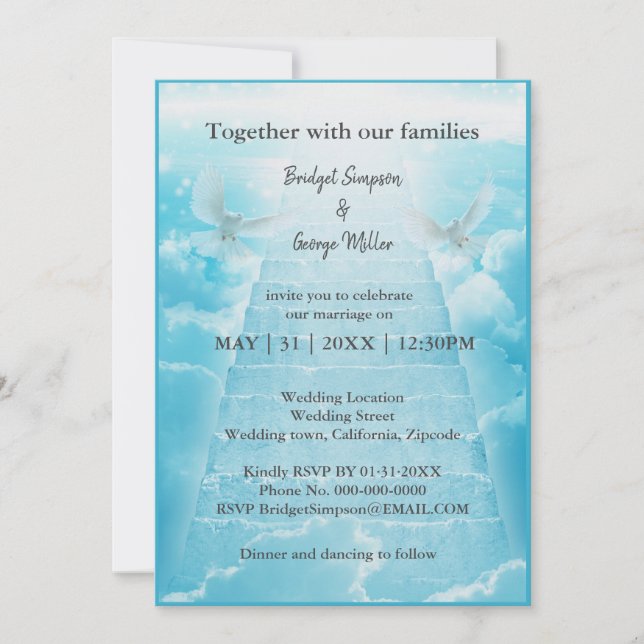 Join us with this romantic wedding invitation card to embark on a journey of love and faith, unite in holy matrimony. With hearts full of joy and spirits lifted by God's grace, the invitation card will sacred your union of your souls. The love, guided by Christian values, shines brightly on this divine path. Imagine a stairway to heaven, where each step represents a moment of divine connection and spiritual enlightenment. Just as clouds adorn the boundless sky, soaring to the heights of cloud nine.