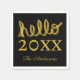 This design is modern simple and fabulous, it features pure black background with a textured metallic golden ribbon type script saying hello and customised typography for the year. Elegant script to personalise design with hosting family name, business name or location, May next year be amazing for all of you. Cheers!