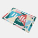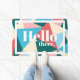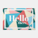 Colourful doormat in geometric triangles with the phrase "hello there." in thick white text.