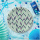 A modern geometric pattern with a multi-coloured herringbone chevron pattern in tones of blue and mint green.