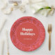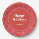 Serve up holiday cheer with these bold and festive custom paper plates, featuring a bright red background, playful pink ribbon bow pattern, and the message “Happy Holidays” beautifully centered with your family name underneath.