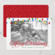This contemporary holiday card features an illustration of strings of bright Christmas lights in red, green, yellow and blue, spanning the top edge of the card. In the centre is a place for your photograph and below, in red script typography, are the words 'Merry Christmas'. Personalise the front with the year, your name, or other custom text - just use the easy, provided templates. The back side is printed with a cheerful red and white sketched dot pattern.