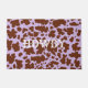 Trendy modern cowgirl or cowboy doormat for student, dorm room, with purple and brown cow spots and howdy greeting. Cow animal print in modern colours
