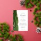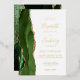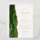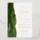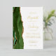 The left-hand edge of this elegant modern wedding invitation features a hunter green watercolor agate border trimmed with faux gold glitter. The customisable text combines handwriting, copperplate and italic fonts in real gold foil on a white background. The reverse side features a matching green and gold agate design.