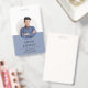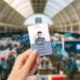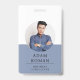A modern minimalist ID badge for a business consultant or other professional title. Simple stylish typography for your name and title with a two tone blue and white background. Replace this sample photo with your own professional photo. Add your social media handle to the back of the badge.