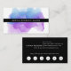 Chic watercolor business cards feature your name or company name layered on a blooming inkblot illustration in bright, colourful shades of indigo blue and violet purple. Add your full contact information to the back in white on crisp black. Includes your custom loyalty offer (shown with "enjoy 20% off any service after five visits"), and six punchouts.