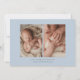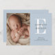 Modern Initial Blue Baby Three Photo Birth Announcement shows your vertical photo on the front, along with baby's initial. Two more photos are on the back.