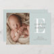 Modern Initial Blue Green Baby Three Photo Birth Announcement